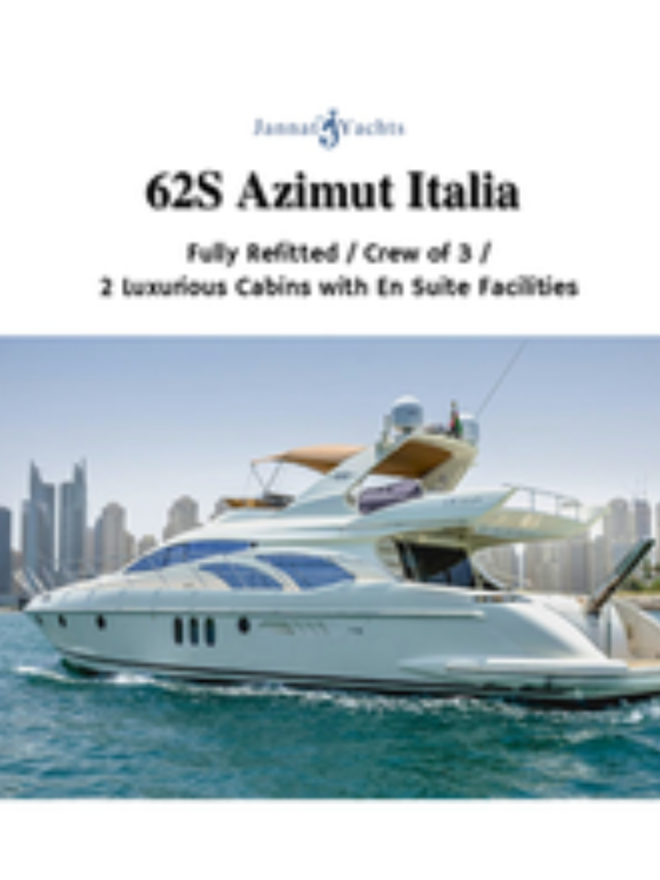 Welcome aboard the luxurious 62S Azimut Italia, a sleek and elegant yacht perfect for your next sea adventure. This stunning vessel offers a spacious and stylish interior with all the modern amenities you could desire. With three comfortable cabins, it can accommodate up to 6 guests for an unforgettable cruise. The outdoor deck area features plenty of seating, a sun lounging area, and a well-equipped wet bar for enjoying the beautiful ocean views. Whether you're planning a romantic getaway or a fun-filled vacation with family and friends, the 62S Azimut Italia is the ideal choice for your next yacht rental.