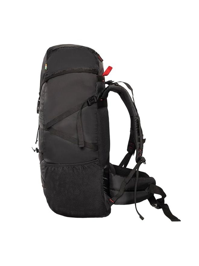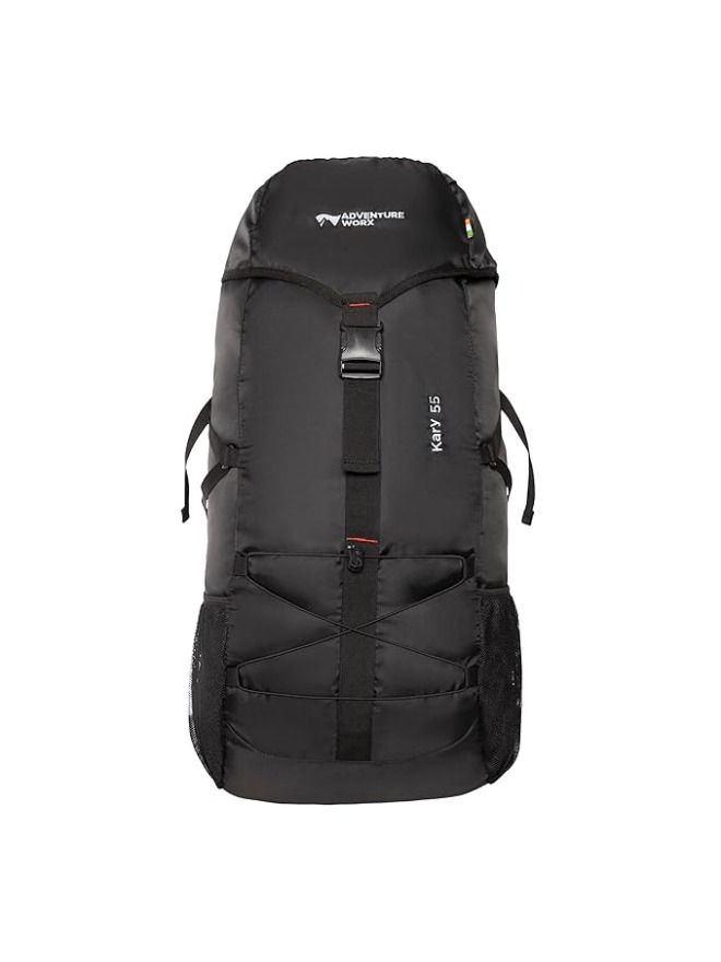 SPACIOUS BACKPACK: Our Kary 55L backpack has 2 compartments that make it easy to segregate clothes and essentials. The top-loading compartment features a cord lock and can be securely closed with the top hood. Additionally, there is a hood pocket for quick access to items. The Water bottle holders on both sides allow you to stay hydrated on the go, and the backpack's inbuilt rain fly protects your gear from sudden downpours.