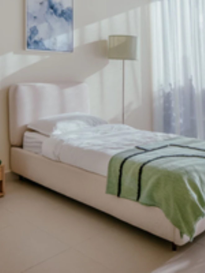 Amanda single bed, with its soft, subtle and delicate fabric upholstery. No Mattress included with the bed.