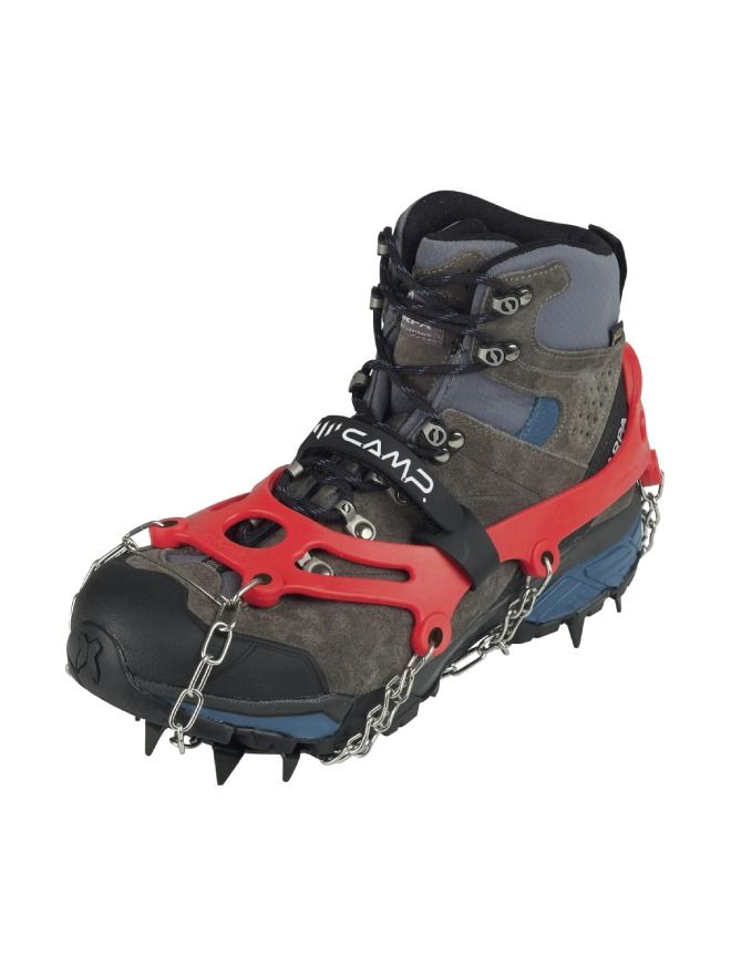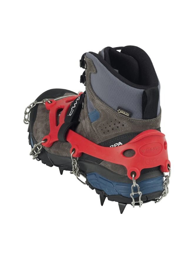 The Camp Ice Master Anti-Slip Crampons offer reliable stability on slippery terrains such as ice and snow. Crafted with durability in mind, these traction devices feature 13 robust 15mm powder-coated steel spikes connected by resilient galvanized steel chains. The elastomer binding system, combined with a secure strap, ensures simple yet safe application over the shoe. Designed with an articulated front platform, they provide a natural walking feel. These crampons come in four sizes, covering shoe sizes from 36 to 47, and include a sturdy hard case for convenient storage.