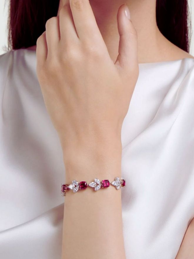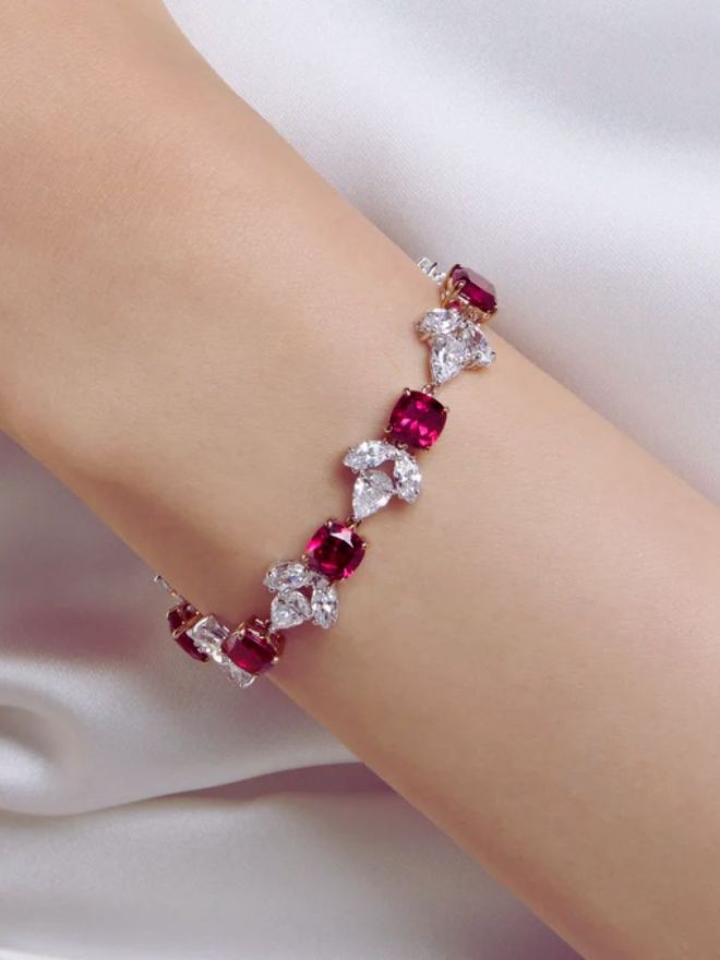 This bracelet is a stunning blend of artistry and elegance, featuring vibrant ruby paired with clear simulated diamonds.