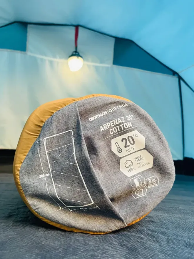 Rent the Arpenaz 20° Sleeping Bag for a cozy, eco-friendly camping experience. Made from organic cotton, this sleeping bag is perfect for warm nights, keeping you comfortable in temperatures up to 20°C. At 2m long, it easily converts into a duvet and can be twinned with another sleeping bag to sleep two, offering versatility and comfort.