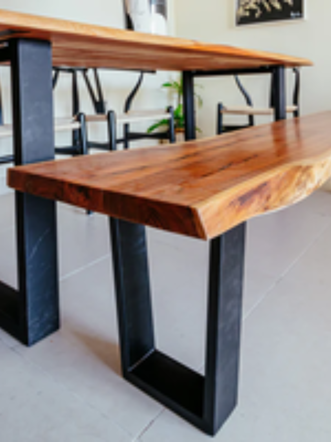 Crafted from solid wood, you'll feel the history underneath you, as the grain and live edges are unique on every piece. Just below are two elegant geometric steel legs finished in matte black, which give the piece its strength and stability.